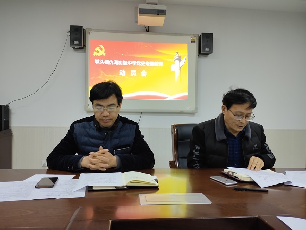 为深入学习贯彻习近平总书记重要讲话精神,以实际行动纪念中国共产党建党一百周年,3月22日,墩头镇仇湖初中党支部按照海安市委组织文件要求召开“学党史”学习教育动员大会。大会由支部书记刘春明同志主持。