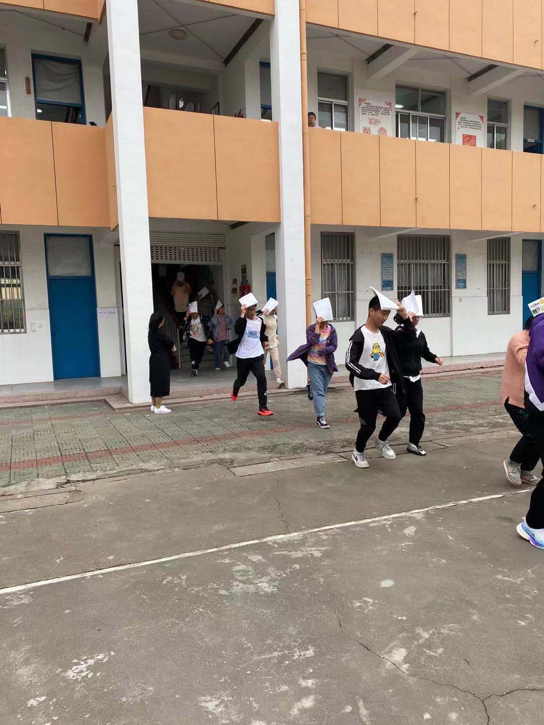 第二次警报声响,班主任指挥学生迅速有序地跑出教室。向操场紧急疏散。学生按着老师的指挥井然有序地一组一组地猫腰、顶着书本,贴着墙角按指定路线快速往楼下跑去,来到教学楼前的操场集中。随后班主任快速清点本班同学人数,及时上报给现场指挥。