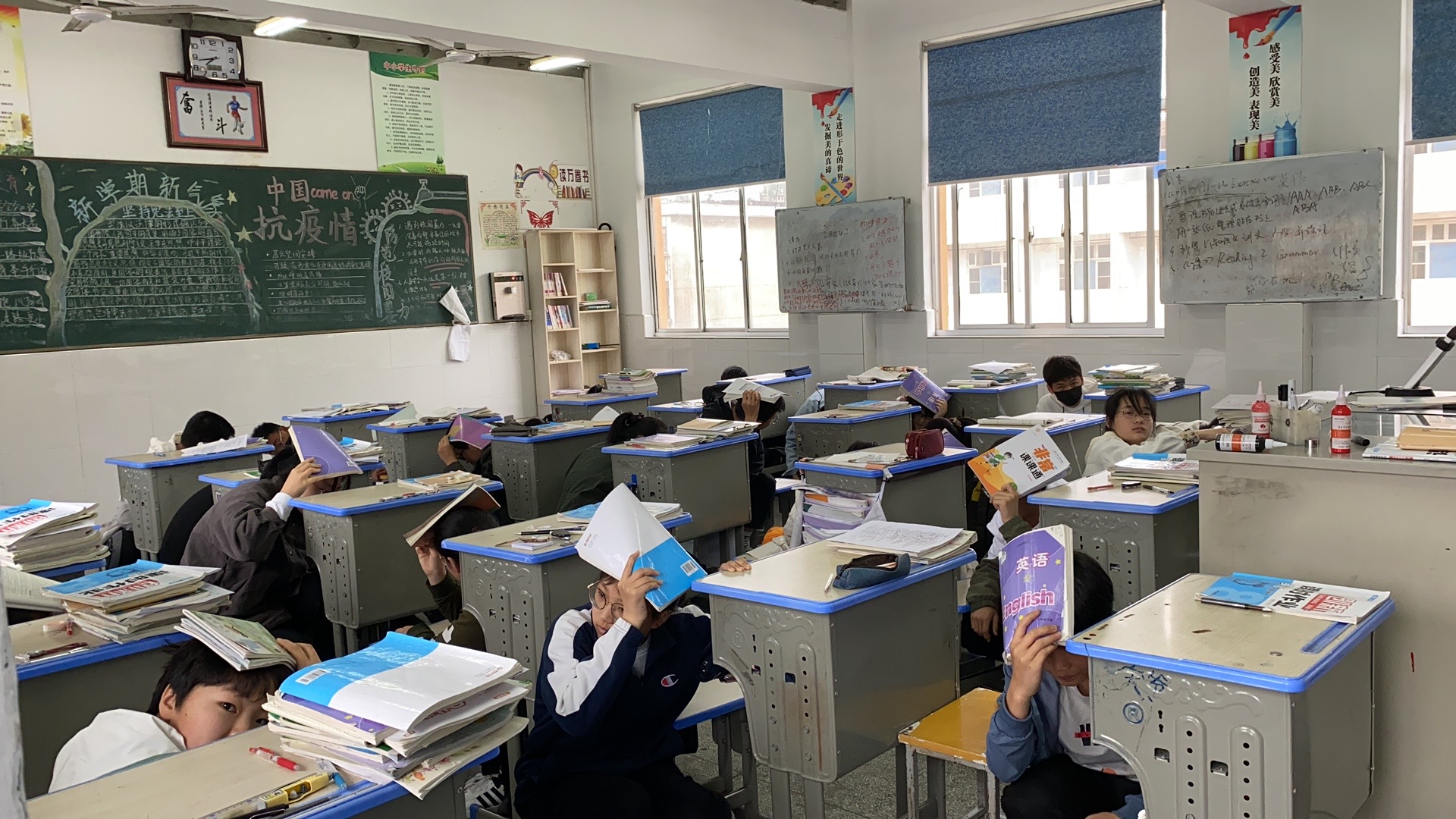 上午9点10分,急促的警报声响彻校园,班主任立即立即告知学生“地震来了,不要慌”,指导学生按照要求用书本护住头部,迅速蹲到课桌旁。楼层、各楼梯口工作人员也各就各位。