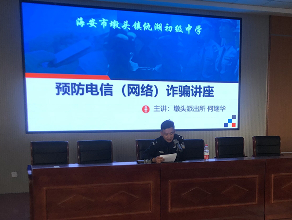 为增强师生防诈骗意识,了解校园防诈骗的知识,5月18日下午,墩头镇仇湖初级中学邀请墩头镇派出所警官何继华,为全校师生及家长举行了一场反网络电信诈骗的讲座,旨在帮助师生及家长们避免网络诈骗。