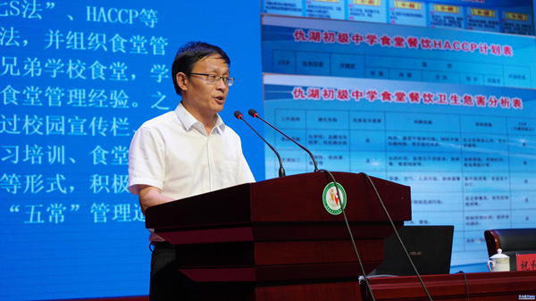 6月16日,2020年海安市学校阳光食堂建设与管理工作推进会在城南实验小学幸福剧场召开。墩头镇仇湖初中校长刘春明作为全市农村初中学校代表作了“细化管理,用心服务”经验交流。