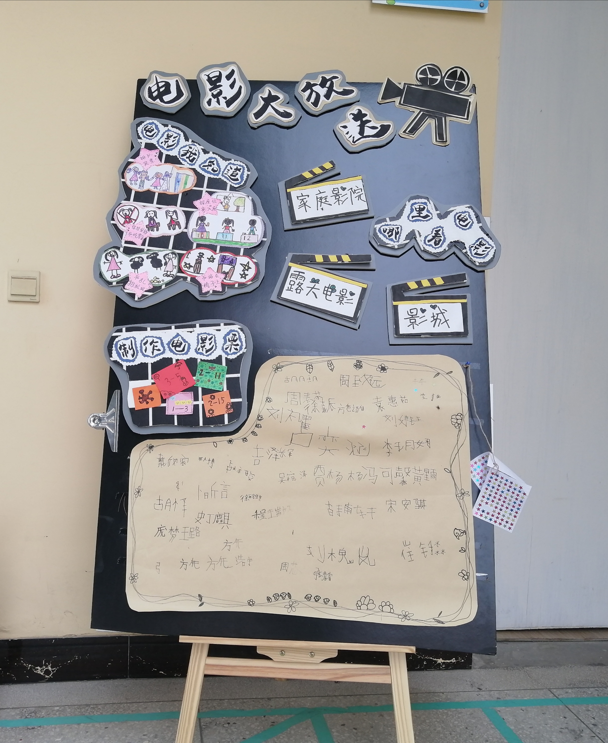 活动前期,大班组的孩子们征集全园小朋友的意见,自制电影大放送海报,并将综合活动室临时改装成电影院,安排座位,张贴座位号。小班中班的孩子们则用自己的方式自制电影票。一切准备就绪,由大班孩子充当检票员,电影院分三个时间段进行电影大放送。