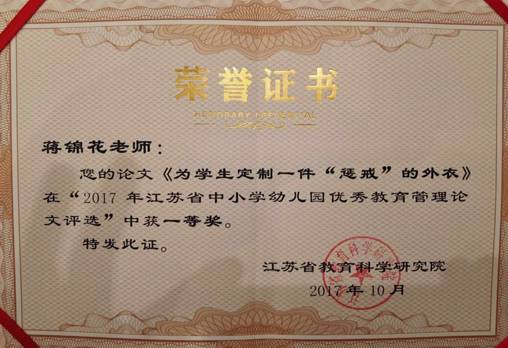 11 月4日,2017年江苏省中小学幼儿园优秀教育管理论文评选颁奖活动在南京新城酒店顺利举行,来自无锡、江阴和南通地区的近100位老师参加了此次活动,来自里下河水乡的美女老师蒋锦花喜获一等奖。