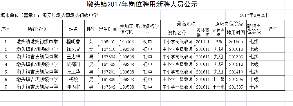 墩头镇2017年岗位聘用新聘人员公示1