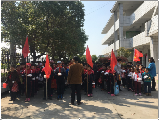 4月1日下午,双溪小学全体师生分为两部分,一至五年级在双溪小学工会主席杨仁根的带领下走在夏永月烈士墓的路上,六年级由林昌宇校长带队前往海安联抗烈士陵园。