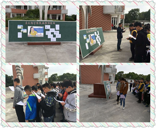 10 月23日上午9点,吉庆初中全体师生集中在鲜艳的国旗下,共同学习了《遏制结核健康和谐》的宣传单,了解了结核病防治的注意事项。跟以往一样,伴随着庄严的国歌奏响,五星红旗冉冉升起。紧接着,由八(1)班张涵同学作了有关结核病防治的演讲,而后由政教处姜主任发放结核病的预防资料,并带领大家共同学习了《遏制结核健康和谐》的宣传单。然后引导学生分班参观《吉庆初中结核病防治宣传》海报,让每一位同学均有所收获。最后,由姜主任作本次活动的总结,并对所有学生提出要求,要求所有参与的同学将自己的收获分享给父母或同伴。