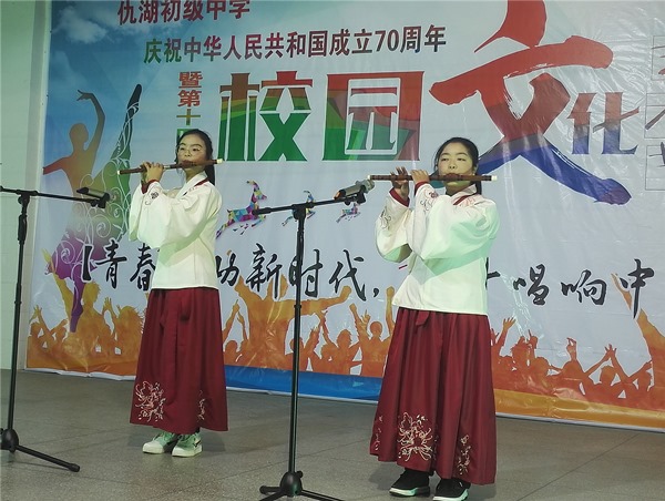 艺术节在初二1班的大合唱《红星闪闪》中拉开帷幕。同学们豪迈激昂的旋律,为大家演绎了新时代仇中学子的青春风采。初一1班诗歌朗诵《祖国,我爱你》、初三1班小合唱《不忘初心》、初三2班舞蹈《我和我的祖国》,抒发了莘莘学子对祖国的无限热爱与深深祝福;初二1班的笛子合奏《牧民新歌》、初二2班笛子独奏《春到湘江》、初二2班古筝独奏《战台风》,初三1班的古典舞《春逝》,在复古味十足的艺术氛围下,为现场观众展示了浓浓民族风情和祖国各地的璀璨艺术。