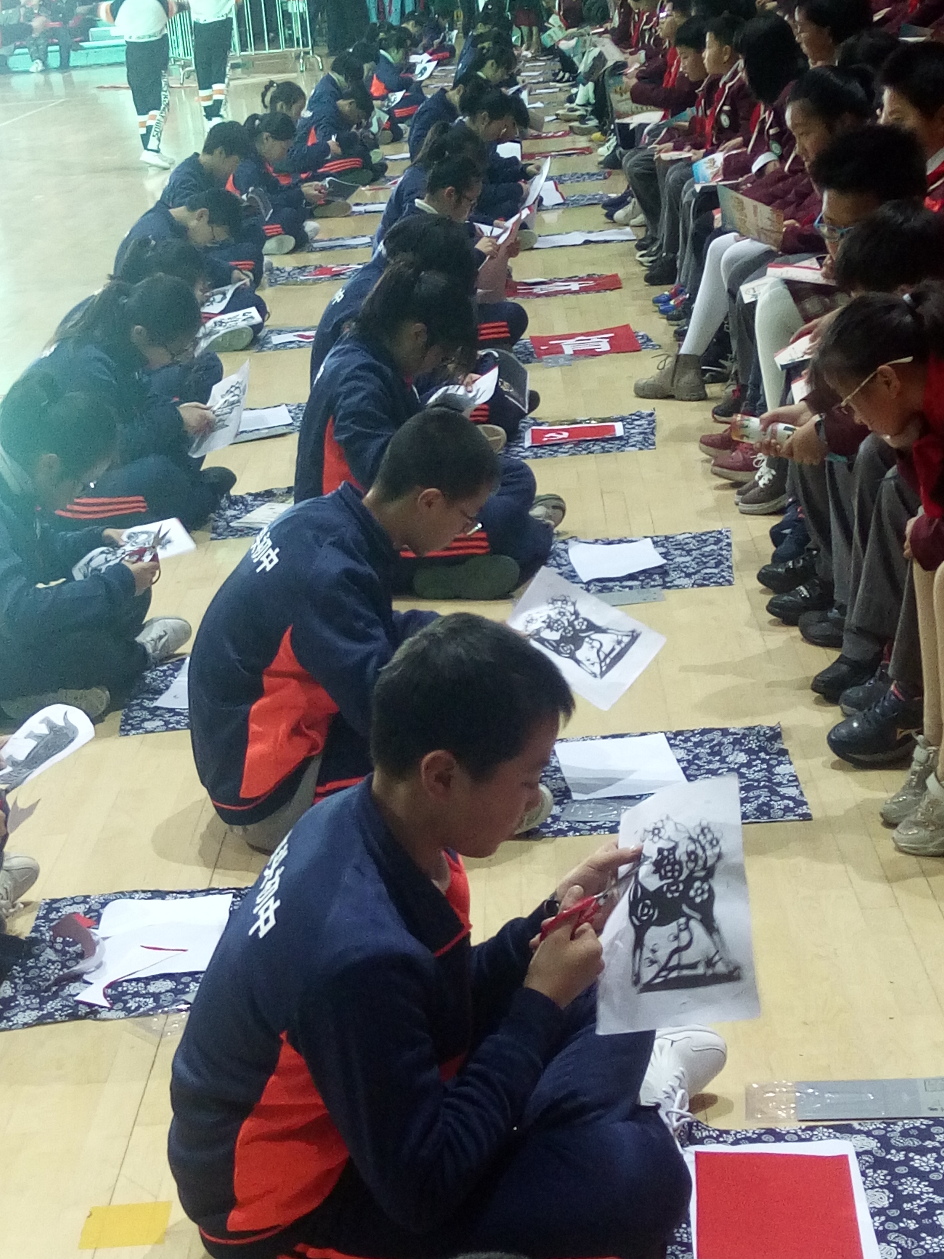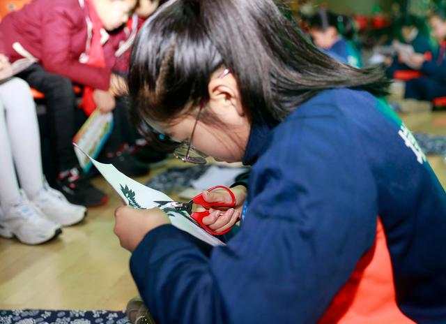 孩子们身着统一校服,席地而坐,在一方蓝印花布上凝神创作。作品内容丰富健康,有雄鹰、蛮牛等力与美的造型,有彩凤、金龙等寓意吉祥的图案,更有凸显活动主题和紧扣新时代的文字图案;形式多样,或粗旷豪放,或凝炼厚重,或细腻清新,或青春蓬勃。这些作品充满了同学们对生活的热爱和对艺术的追求。他们以彩纸为心田,承载对艺术的渴望,探寻未来;他们以剪刀为心路,彰显对美好的追求,播撒梦想。