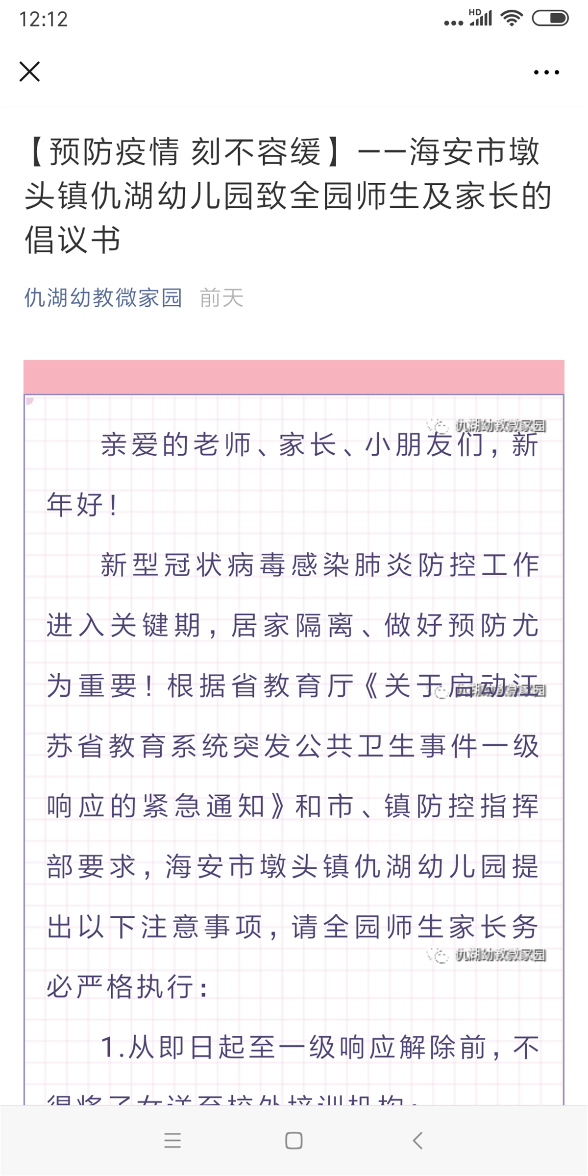 为进一步做好新型冠状病毒感染的肺炎防控工作,有效防止疫情传播,维护广大群众身体健康和生命安全,仇湖幼儿园向全园师生、家长和小朋友发出倡议书: