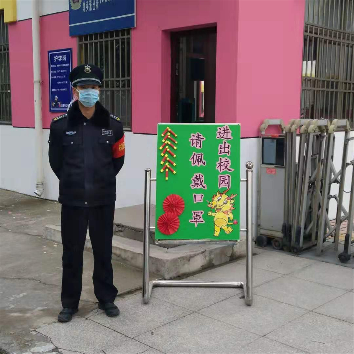 为实行封闭式管理,幼儿园大门口公告板张贴“进入校园,请自觉佩戴口罩”的警示标语。保安人员24小时值班值守,做好自身防护,主动佩戴口罩,保持门卫室卫生清洁,通风透气。加强门卫管控,严控进校人员、非本园教职工一律不得进入校园;外来人员办理事务时一律在传达室完成;必须进入园内时,一定要佩戴口罩、查验身份、做好登记,进行体温监测等工作,确保春节期间幼儿园安全稳定。