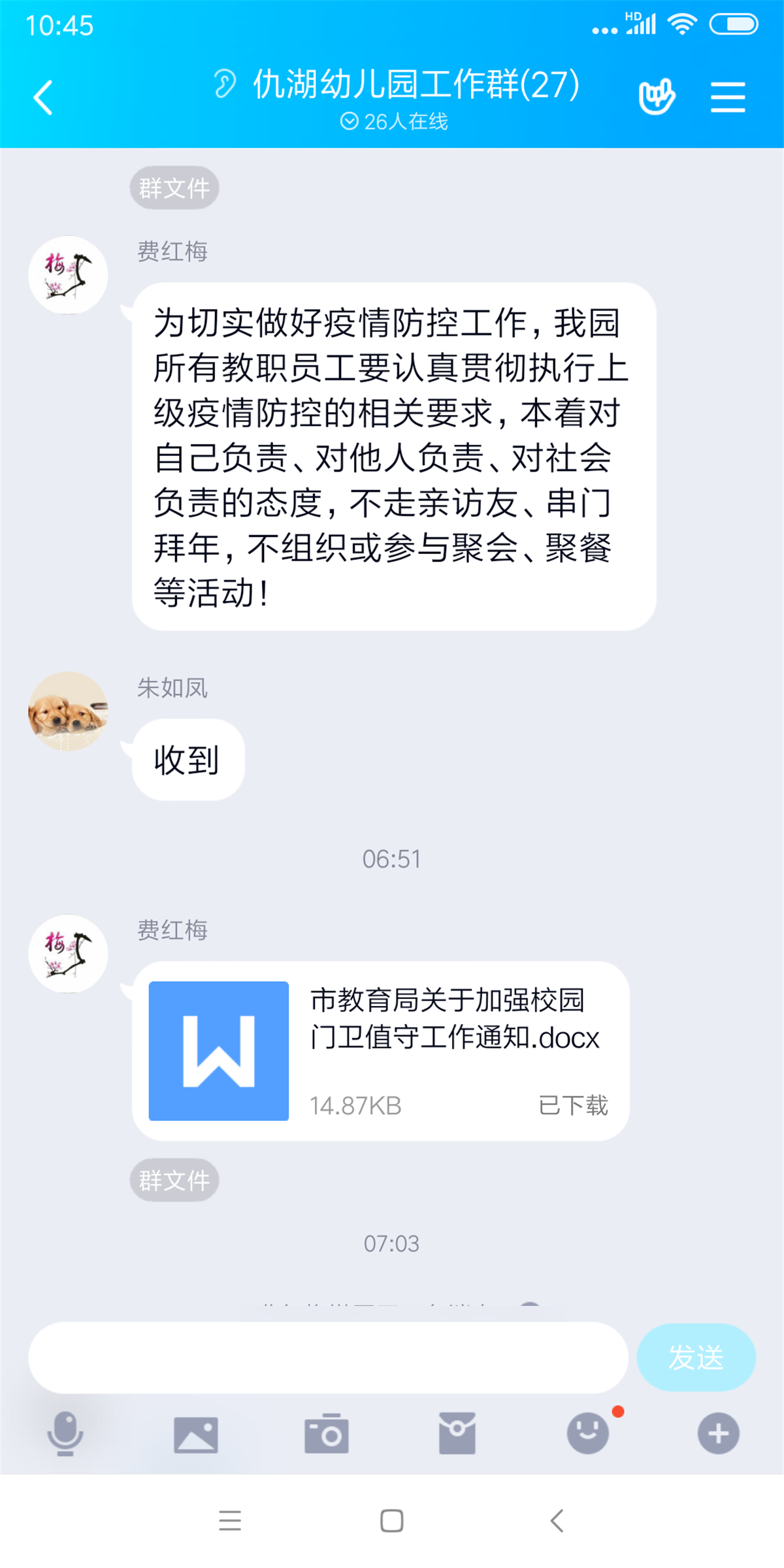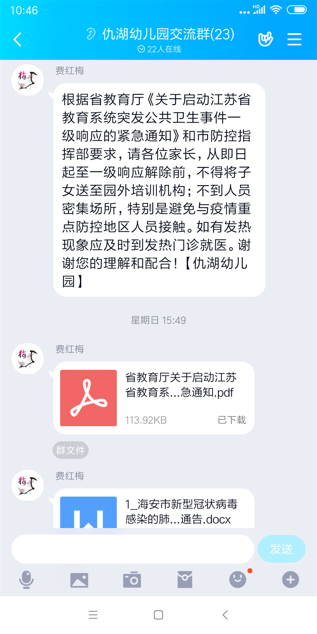 当前,新型冠状病毒感染的肺炎疫情防控工作正处于关键时期。根据《南通市教育局关于做好新型冠状病毒肺炎疫情防范工作的通知》,仇湖幼儿园园长费红梅通过《仇湖幼儿园工作群》传达市教体局下发、转发的各类文件、指示、通知和要求等。建立仇湖幼儿园疫情防控工作组,明确相关人员和职责,制订《仇湖幼儿园新型冠状病毒感染的肺炎疫情防控工作预案》。