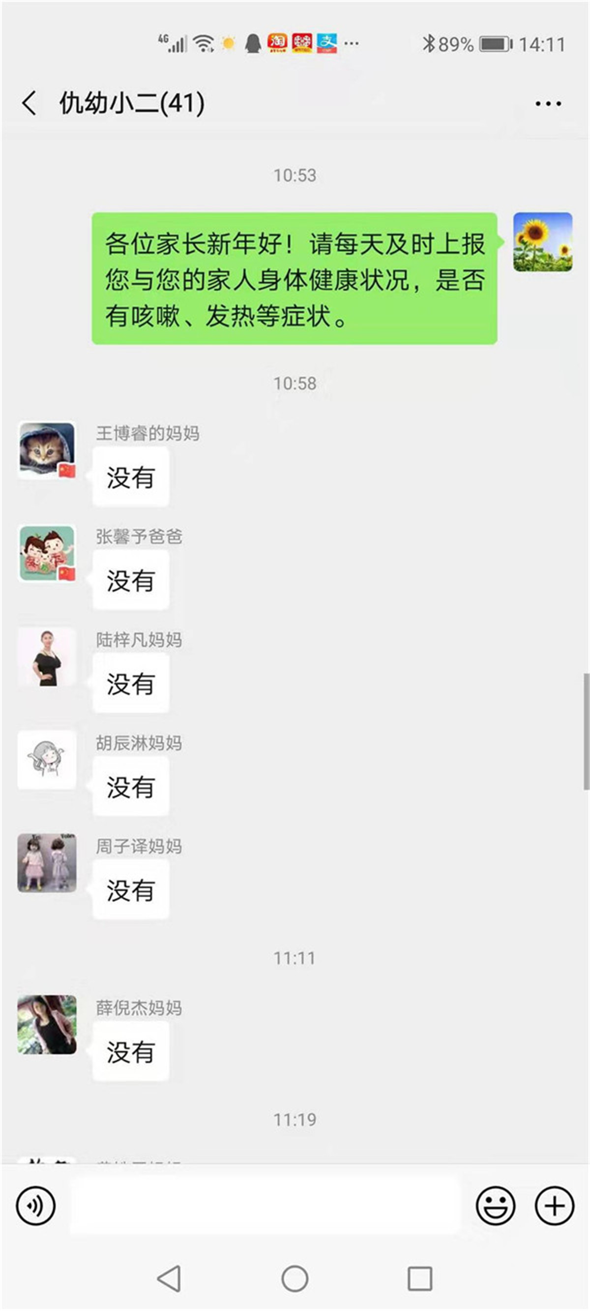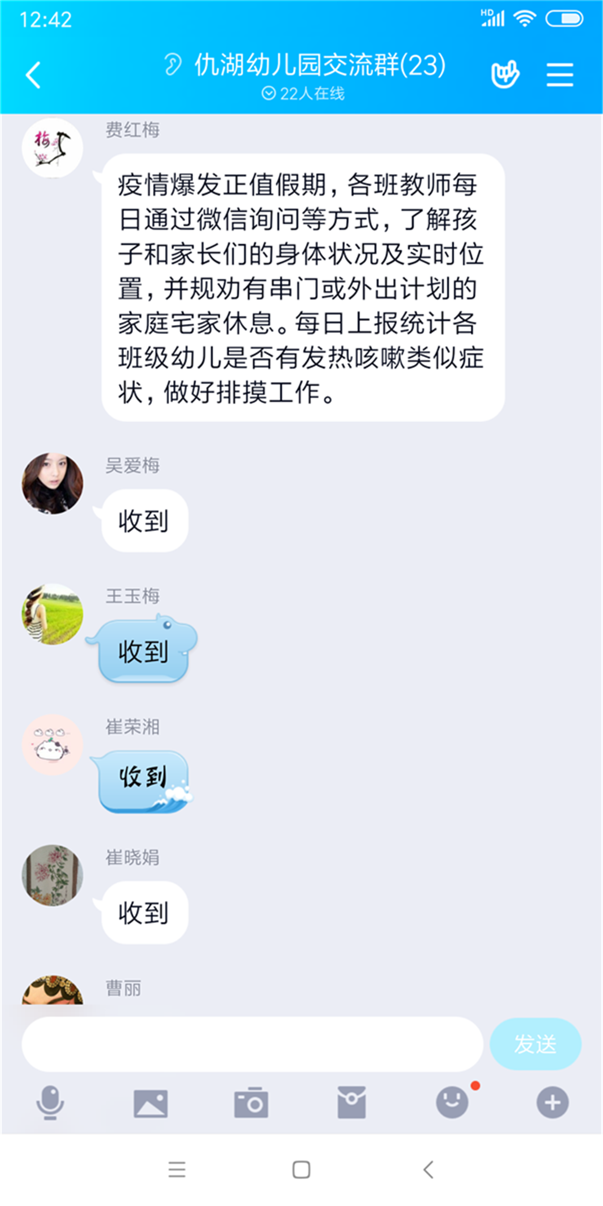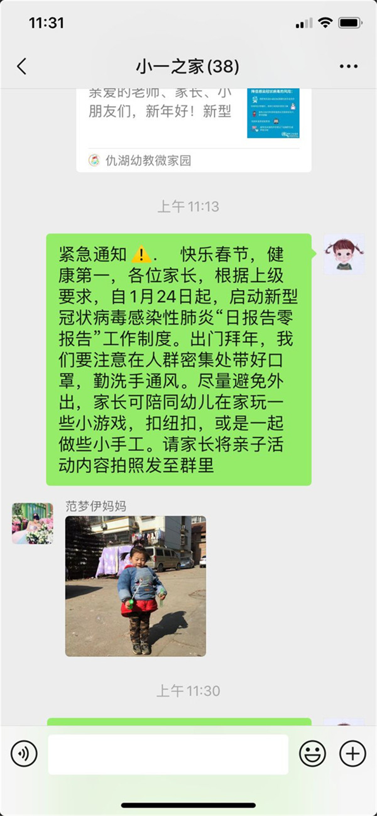 园长费红梅从接到上级领导关于疫情防控工作的通知后,迅速在幼儿园工作群中开展相关工作,要求全园教职工自查健康状况以及湖北相关史,并上报当前所处位置;要求各班教师每天通过电话、qq、微信询问等方式,了解班级孩子和家长们的身体状况及实时位置,并规劝有串门或外出计划的家庭宅家休息。
