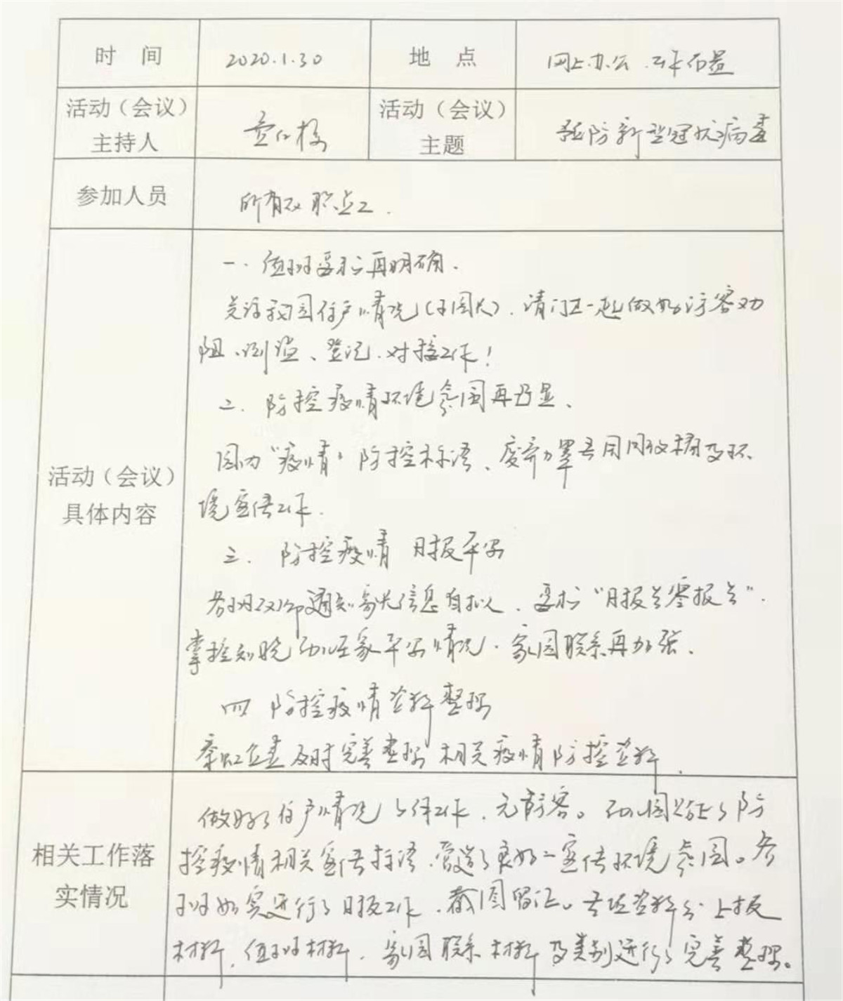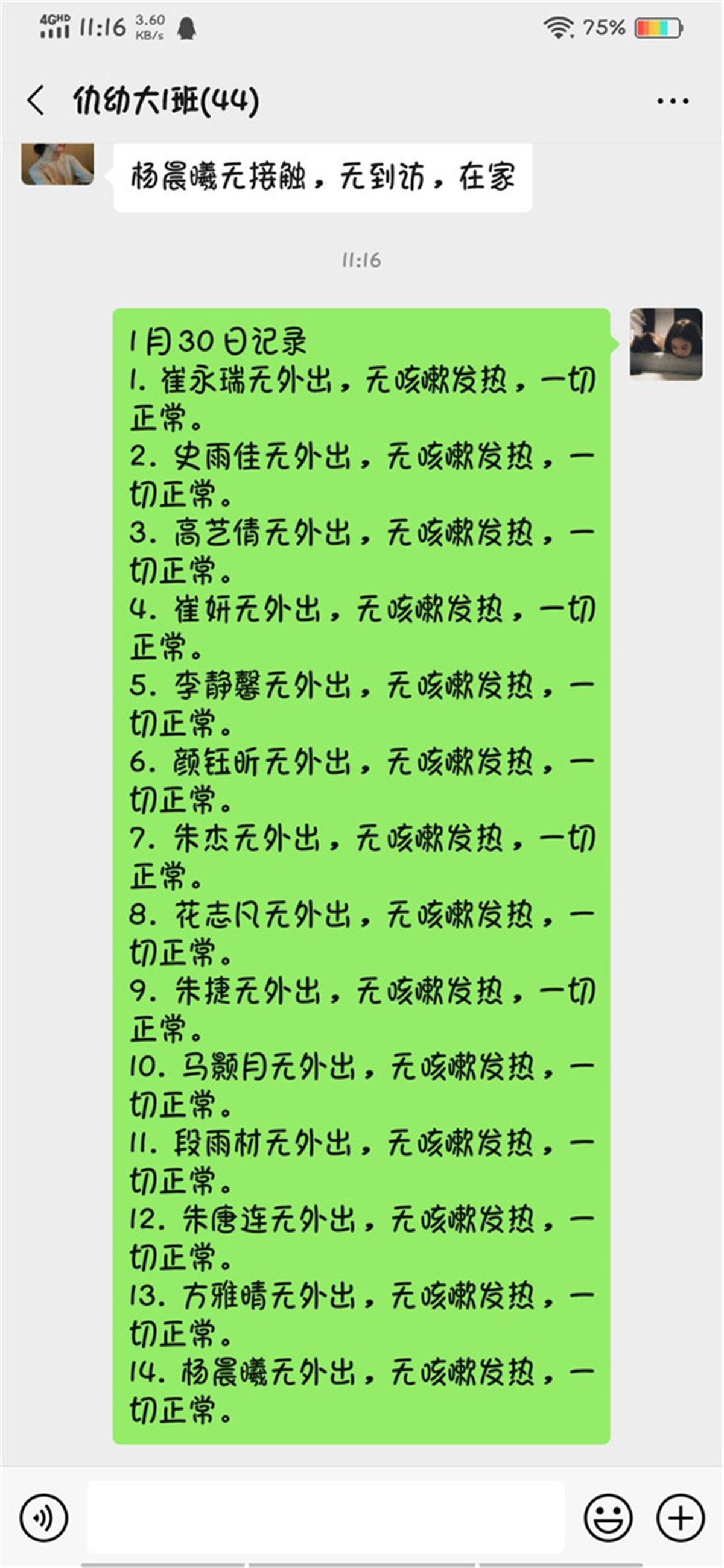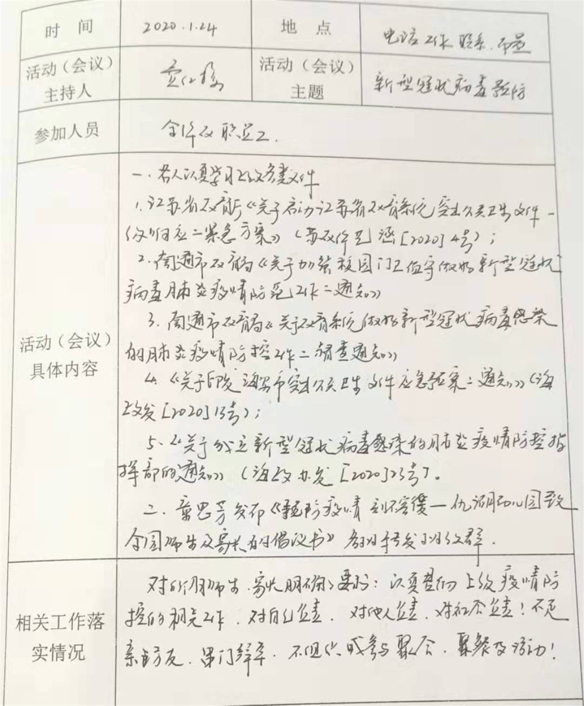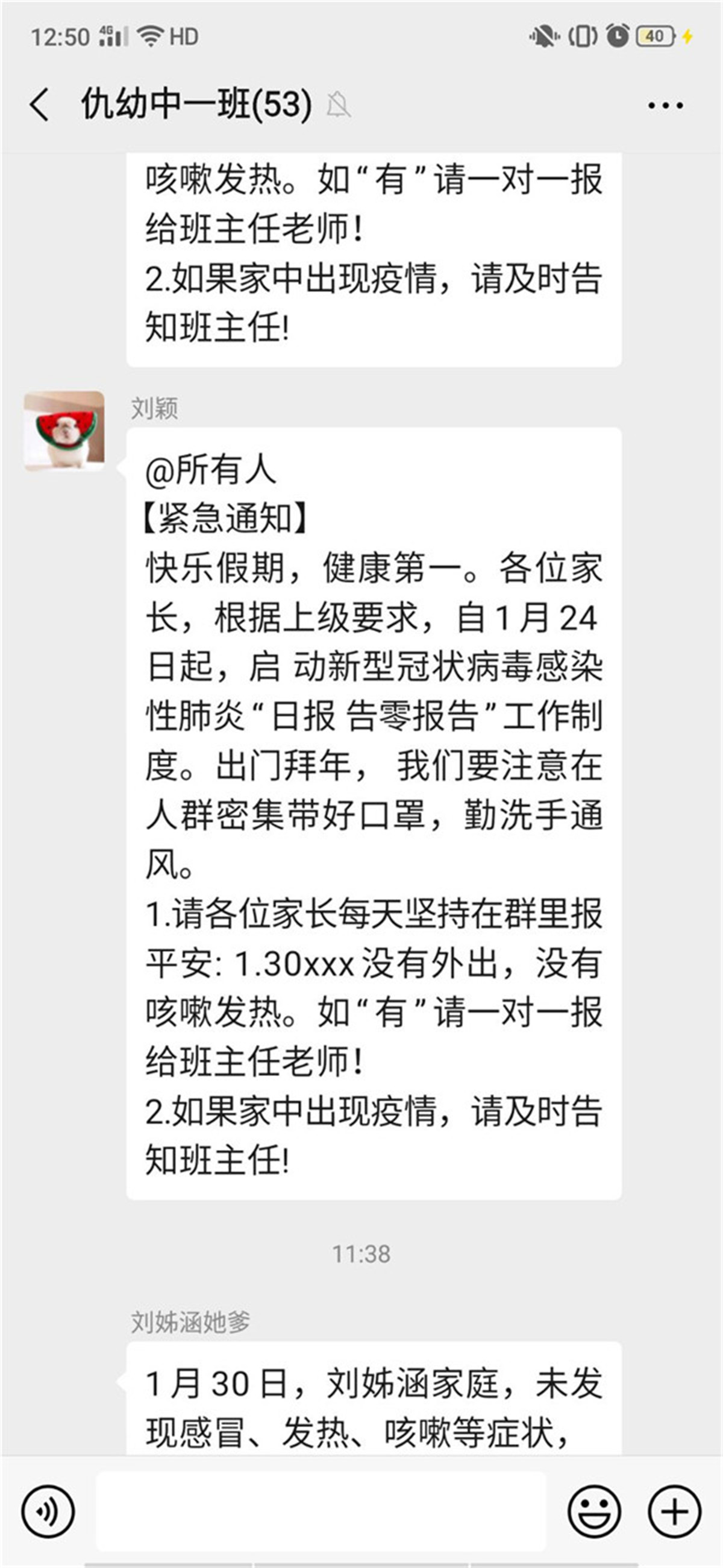园长费红梅从接到上级领导关于疫情防控工作的通知后,迅速在幼儿园工作群中开展相关工作,要求全园教职工自查健康状况以及湖北相关史,并上报当前所处位置;要求各班教师每天通过电话、qq、微信询问等方式,了解班级孩子和家长们的身体状况及实时位置,并规劝有串门或外出计划的家庭宅家休息。