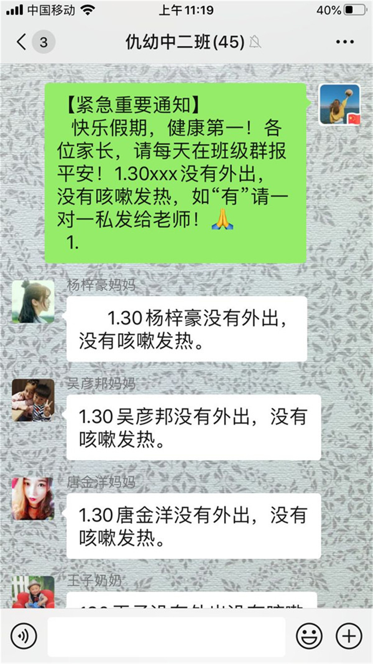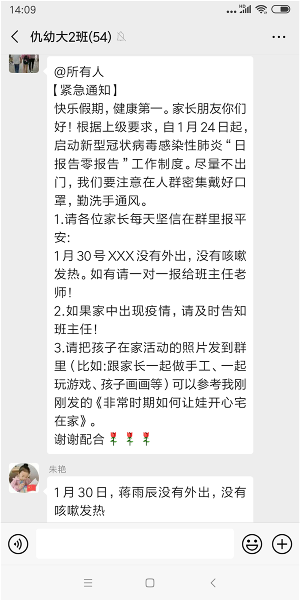 疫情爆发正值假期,各班教师在第一时间通过电话询问, qq、微信通知等方式,了解孩子和家长们的身体状况及实时位置,并规劝有串门或外出计划的家庭宅家休息,和孩子在家一起阅读、玩游戏、做运动等,通过形式多样的活动增进亲子之间的感情。各班教师每日按时上报统计各班级幼儿是否外出、是否有发热咳嗽类似症状,做好排摸工作。