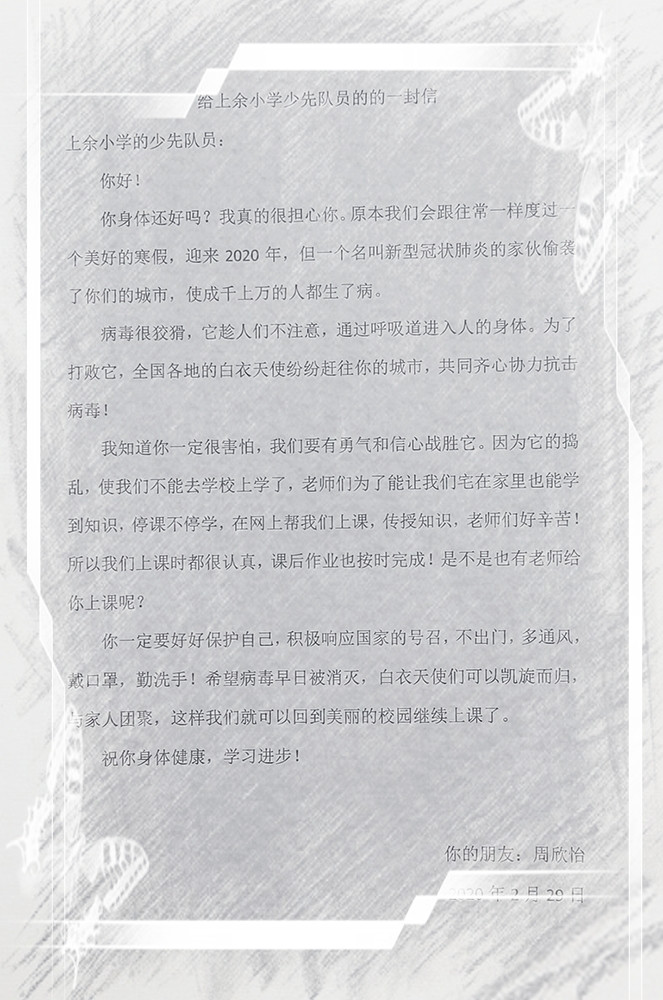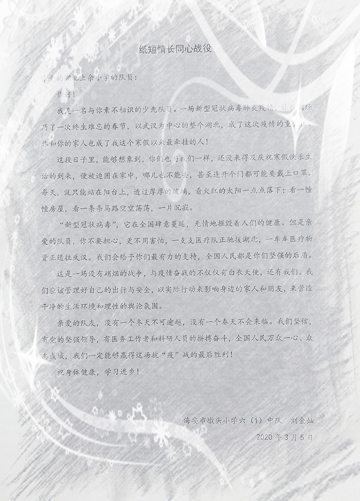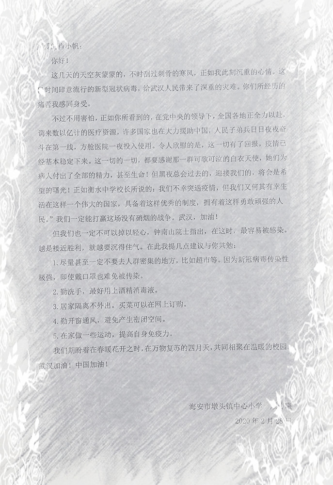 情浓笔韵 纸短情长 来源: 发布时间:2020-03-07 00:00:00 浏览次数: 次 【字体:小 大】 2020年初,一场突如其来的疫情打乱了人们的脚步。在这场战“疫”中,墩头镇中心小学的少先队员们纷纷拿起笔,用爱写出了对黄石市阳新县三溪镇上余小学队员的关心与祝福。一段段温暖的言语力透纸背,给了队员们一往无前的勇气和众志成城的决心,更给了队员们战胜一切的信心!春天正向我们走来,让我们静待花开! 分享到: 【打印正文】