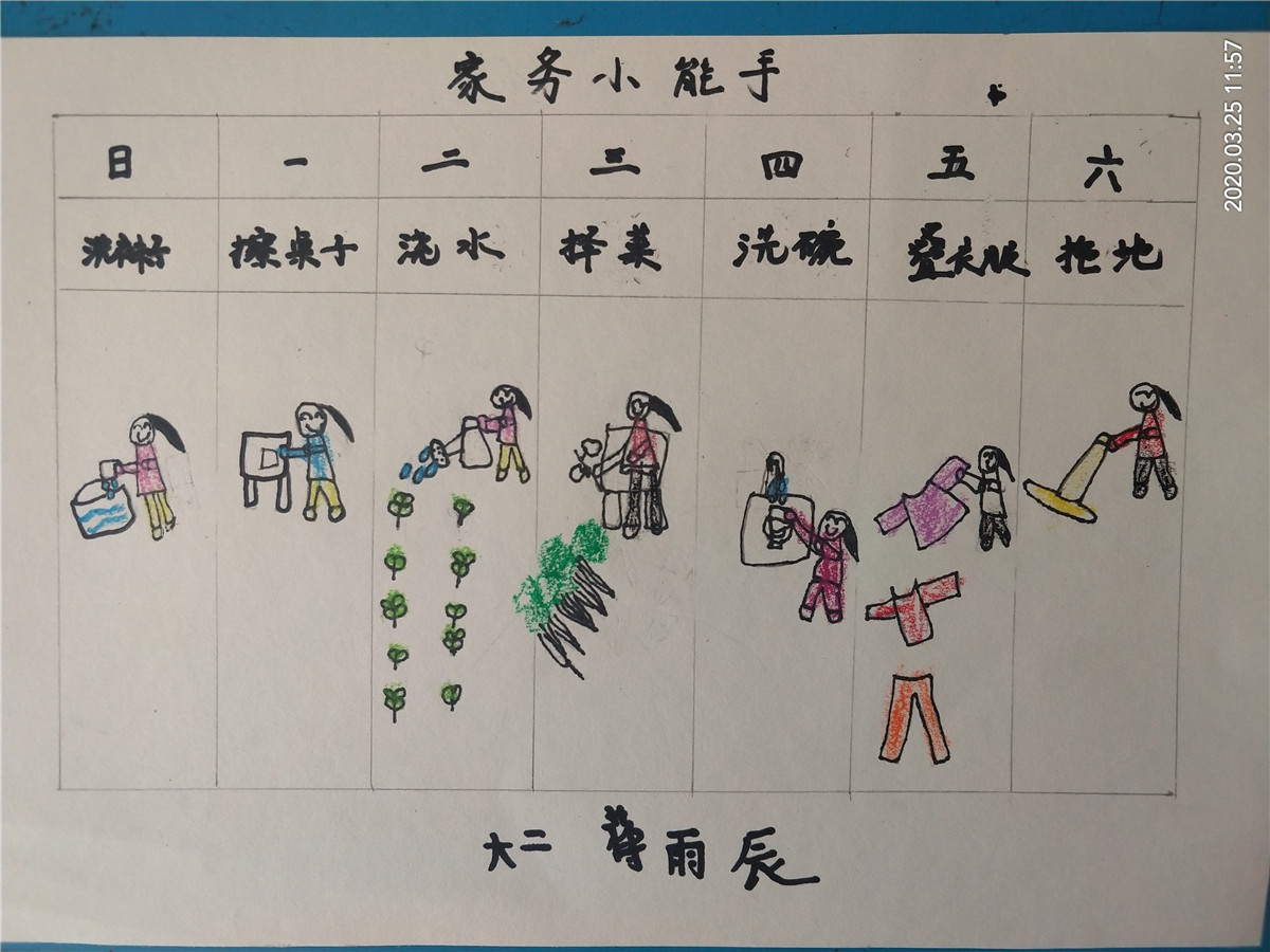 疫情期间,我们虽然宅在家里,但是我们宅得有意义。瞧!我们大班的孩子真是厉害,洗碗、扫地、拖地、浇水、叠衣服、擦桌子、收拾碗筷……个个都是劳动的小能手。