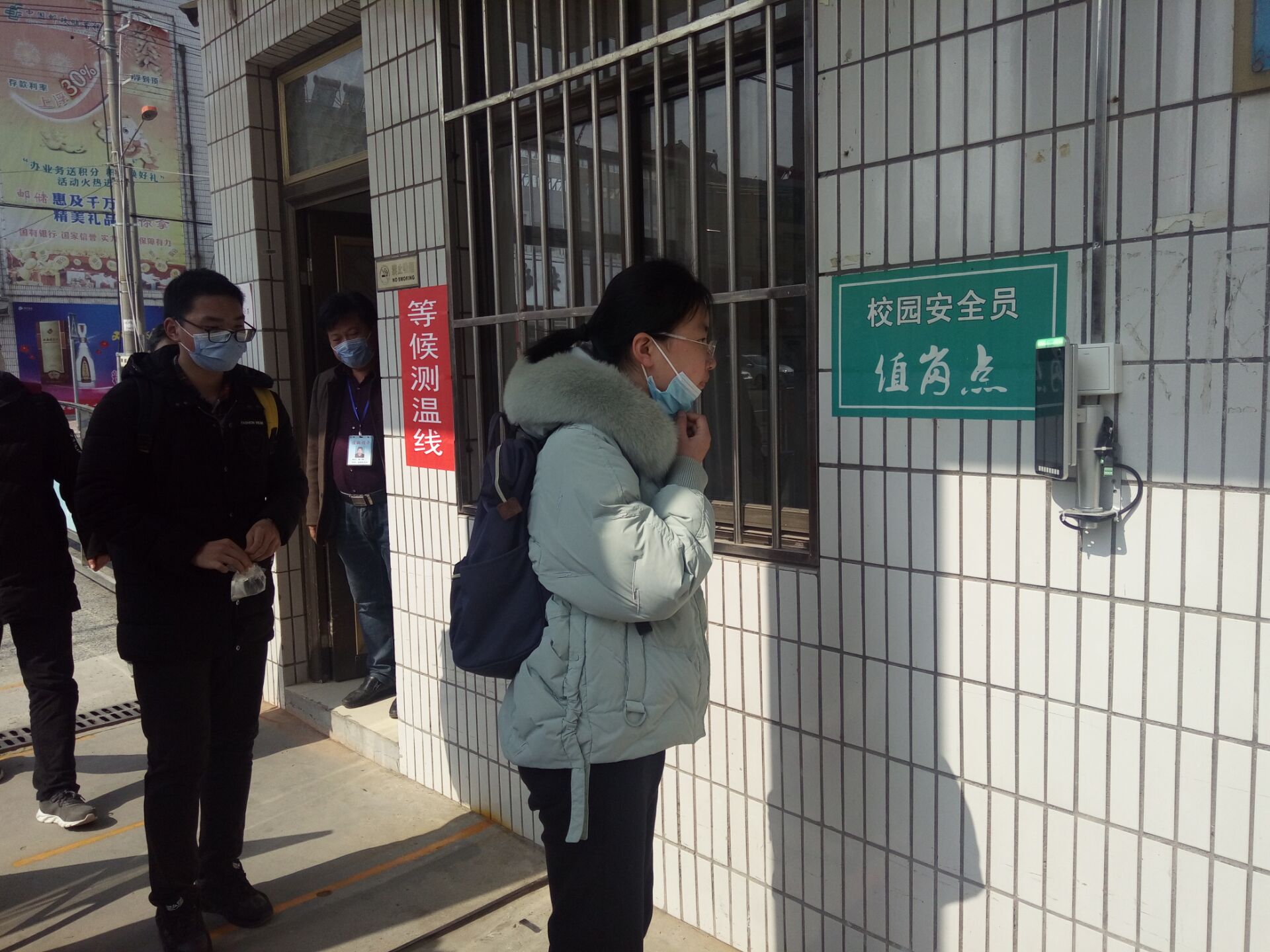 韩勇校长宣布演习开始后,学生排队依次进入学校大门口后,统一进行红外体温检测,前后保持一米的距离,体温正常,无感冒、咳嗽症状学生按既定路线依次入班。在此过程中,发现体温达38.1°C的学生,红外检测系统发出刺耳的警报声,应急处置预案立即启动。