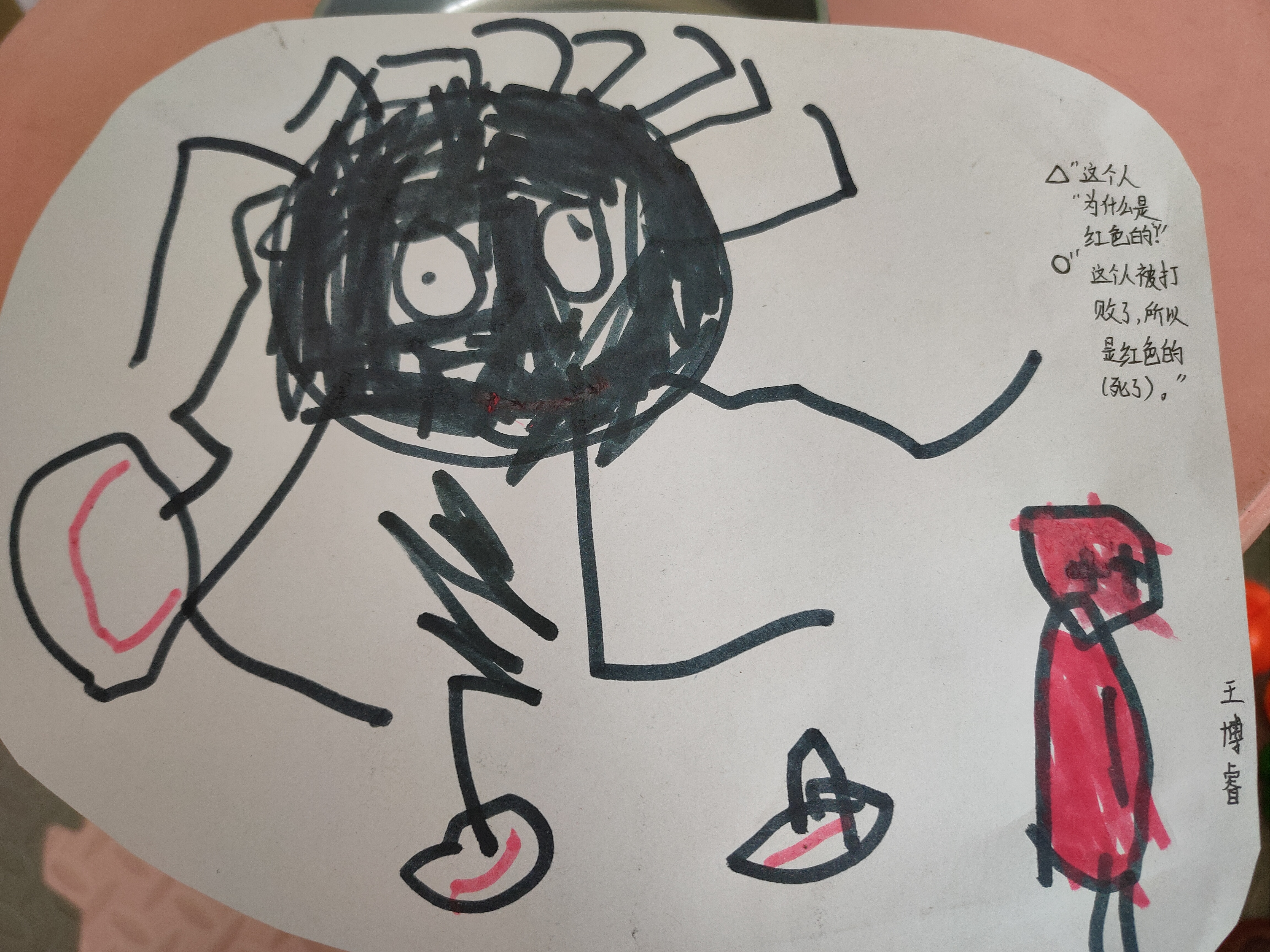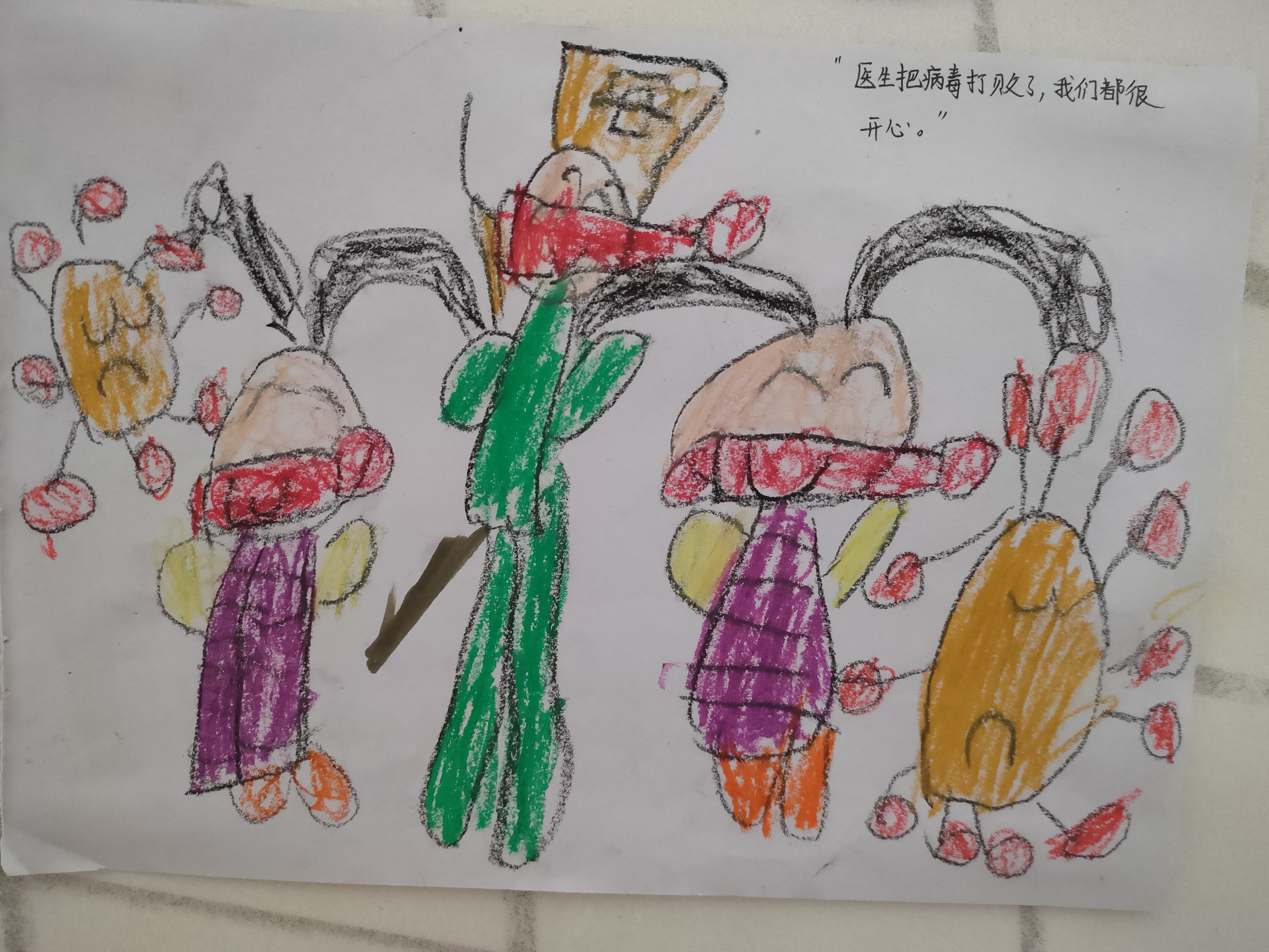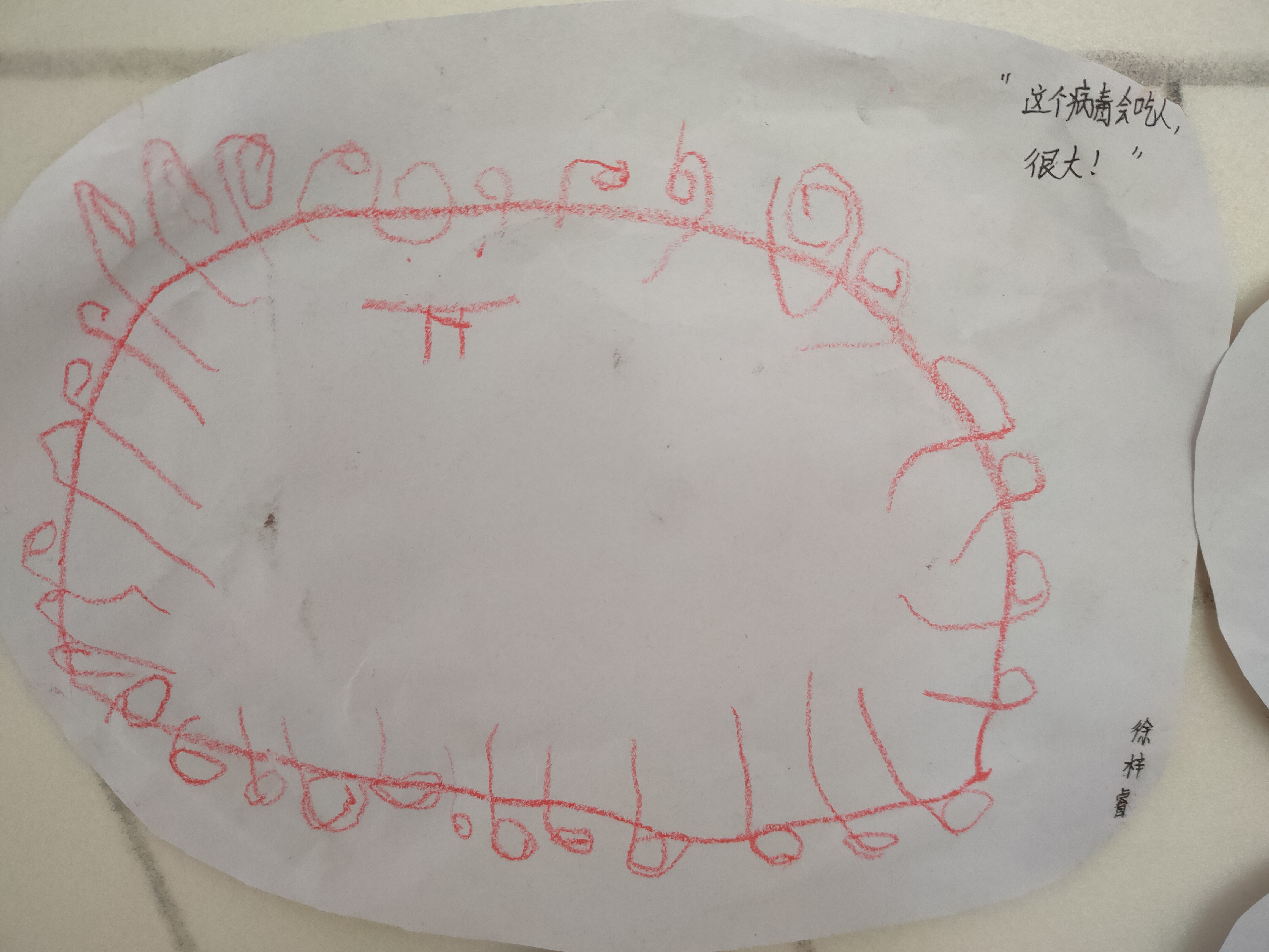 “这个病毒叫什么名字呀?”“它叫新-冠-病毒!”洋洋严肃认真得说出来。“为什么叫新冠病毒呢?”有小朋友说:医生说的,爸爸妈妈这么告诉我的。小博睿说:“冬天冷,病毒要戴帽子,所以叫新冠病毒。“宝宝们,会画病毒么?”我问孩子们。“会!”孩子们异口同声,脆脆的回答我。“这个嘴巴为什这么大?”我看着睿睿的作品问他。“因为它会吃人呀!好多人都被传染了。”“瑶瑶,你画得什么?”瑶瑶轻轻得告诉我“这个病毒会飞,到处都有!”“你这个病毒好大呀,人为什么涂成了红色?”看着小博睿的画儿,我不明白。他边指边说:“这个人死了。”……