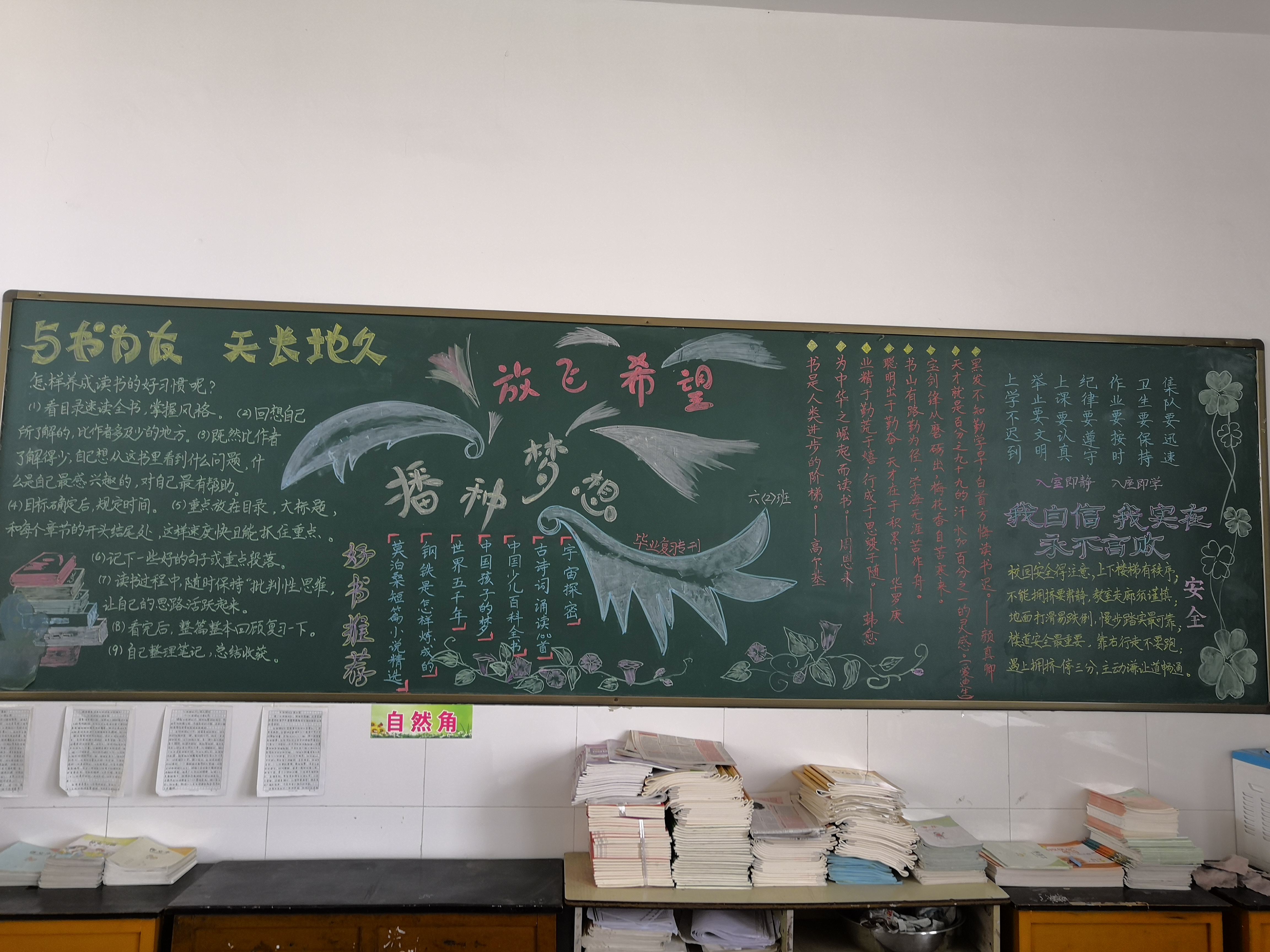 各班利用板报,宣传读书的好处,分享读书好方法,推荐好书大家读。图书角整齐地摆放着孩子们喜欢的各种各样的书籍。