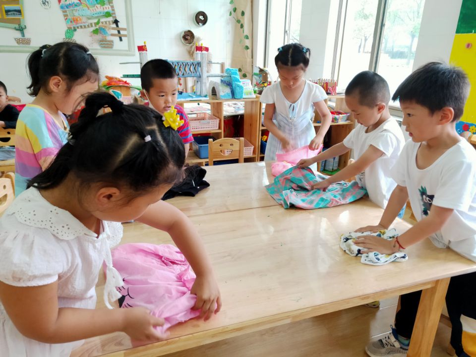 著名教育家陈鹤琴先生提出:“凡是儿童自己能做的,应当让他自己做。”通过一段时间的成长,孩子们的自理能力有了很大的进步,穿衣穿裤不在话下!拿衣、甩袖、拉拉链,三步到位!“两扇大门关一关,两只小手抱一抱……”孩子们在老师的带领下一边说着儿歌,一边将自己的衣服叠整齐。孩子们个个动作麻利,体验到自我服务带来的快乐。