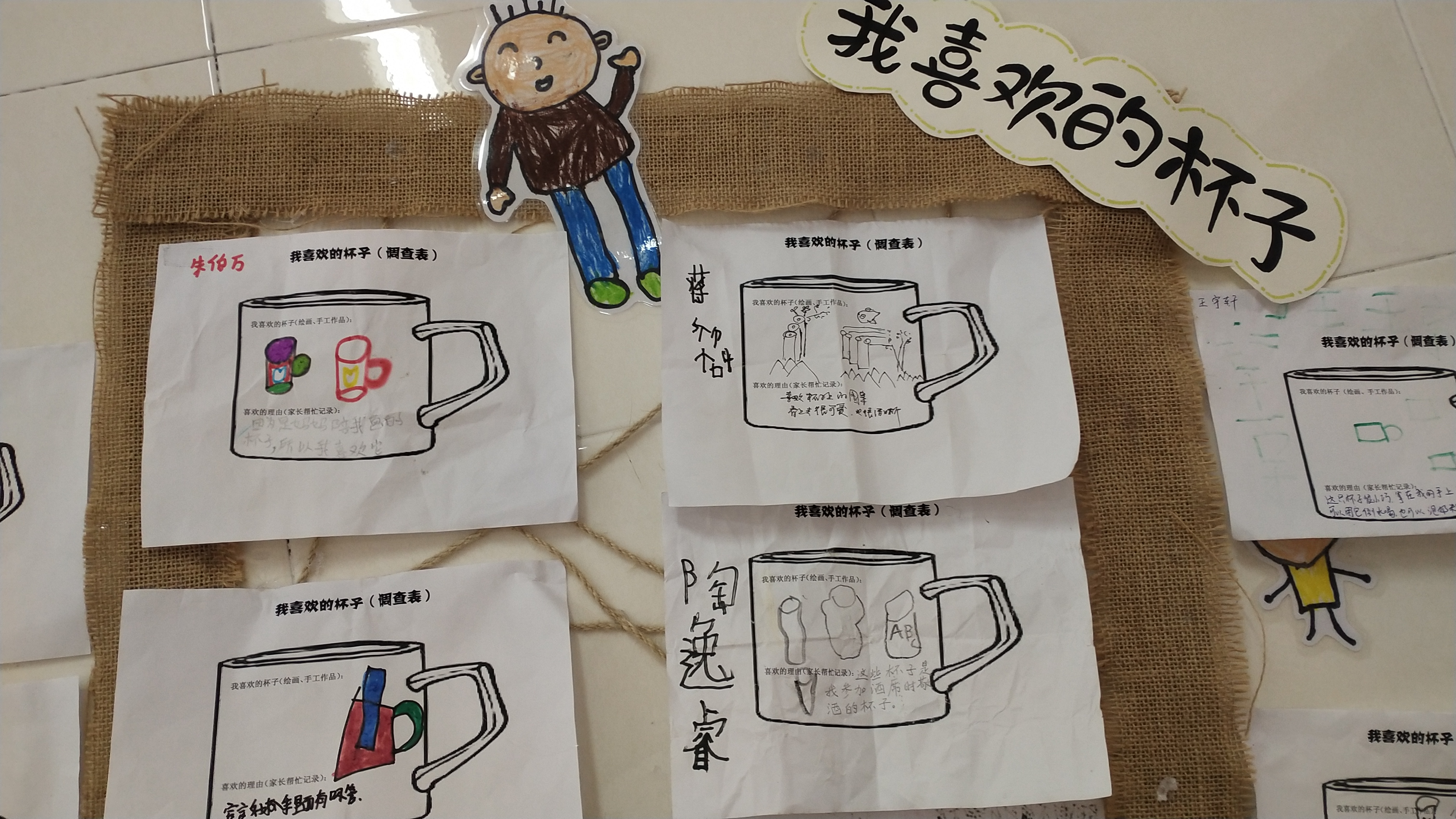 依依你喜欢什么样的杯子?我喜欢我妈妈喝水的杯子,上面有一只小兔子。我喜欢我自己的刷牙杯,上次我不小心摔了一下,没有破哦。睿睿的问题一下子激起了孩子们讨论的兴趣,于是带着这个问题,我和孩子们围在一起设计了《我喜欢的杯子》调查表,孩子们在调查表上记录了关于杯子的秘密!
