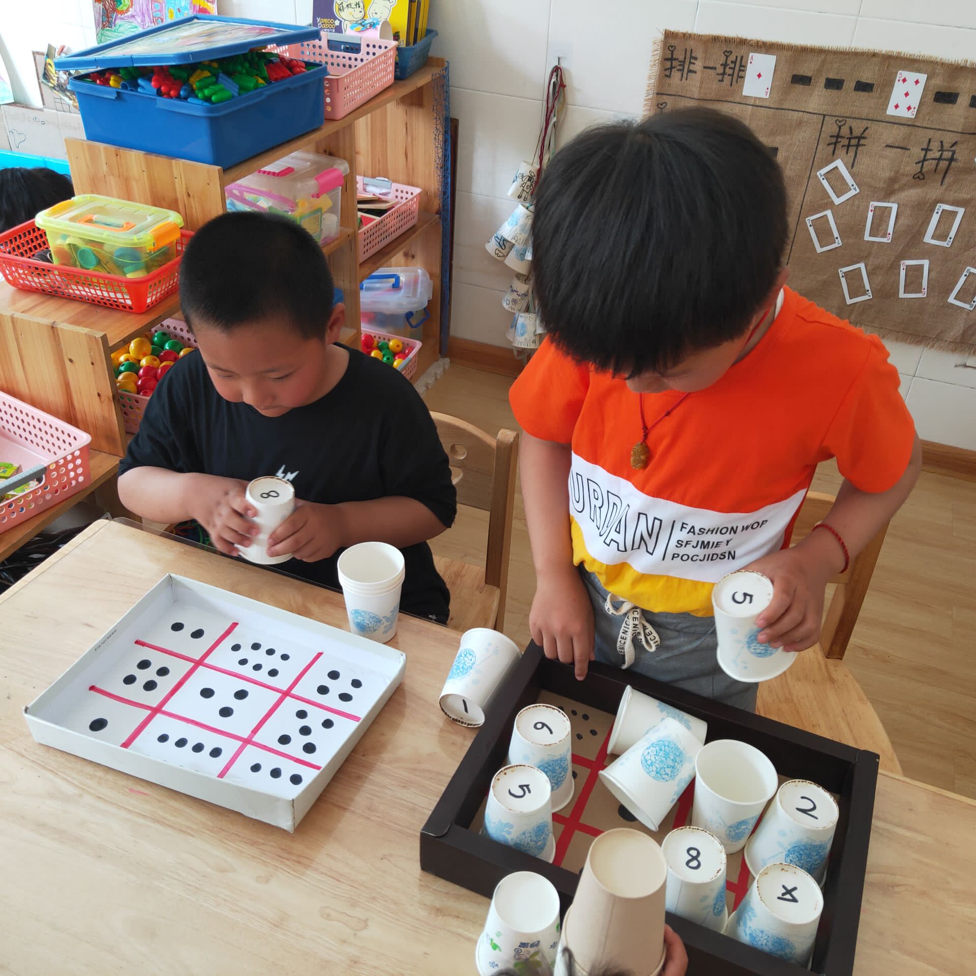 孩子们在游戏中相互协商,共同合作,完成作品。他们结合自己已有的生活经验进行创意构思、巧妙游戏,数物对对碰、叠叠高、数点朋友、水果消消乐,吹杯子、传声筒,都是他们喜欢的游戏。
