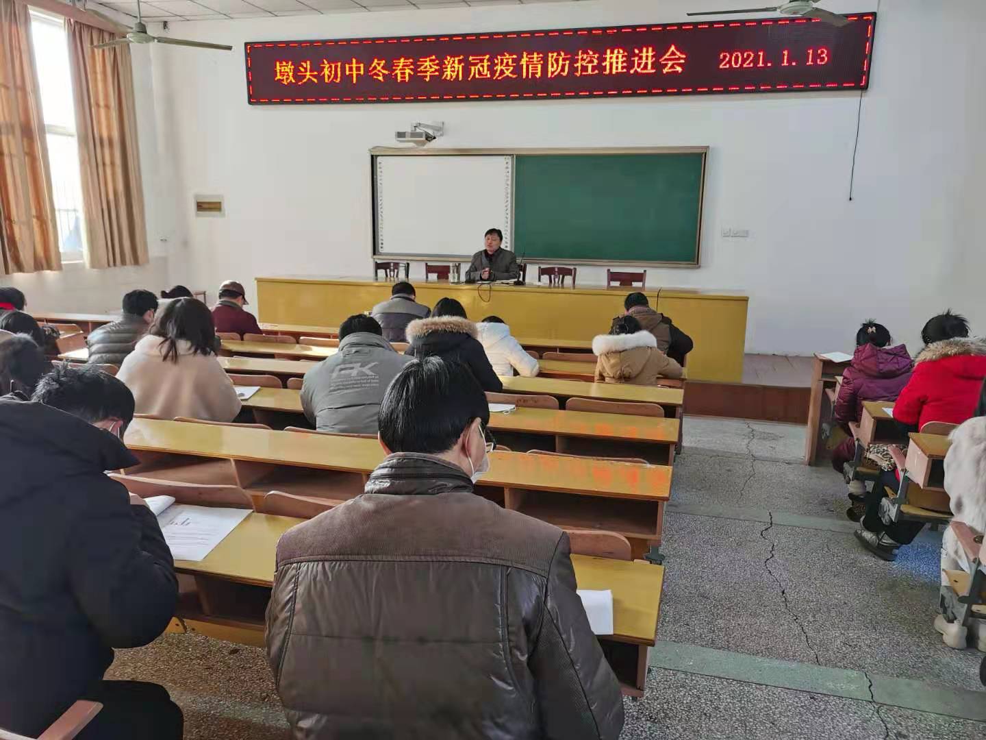 1月13日上午,墩头初中在阶梯教室召开冬春季疫情防控会议,全体教职员工参会。