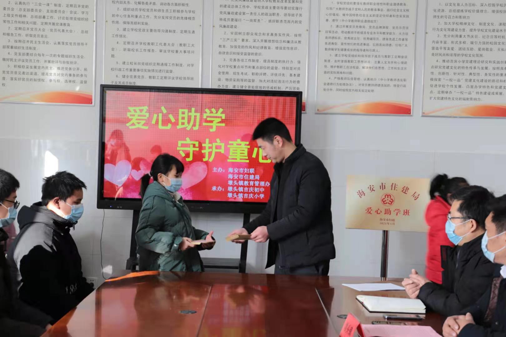 寒冷的冬日,洋溢着暖阳。1月29日上午,海安市住建局“爱心助学班”开班典礼在墩头镇吉庆小学举行。海安市妇联副主席马冬花、陶慧文,海安市住建局副局长杨勇,墩头镇党委副书记杨华,墩头镇教育助理陆军,吉庆初中校长王忠根,吉庆小学校长林昌宇,“爱心助学班”全体成员参加了活动。