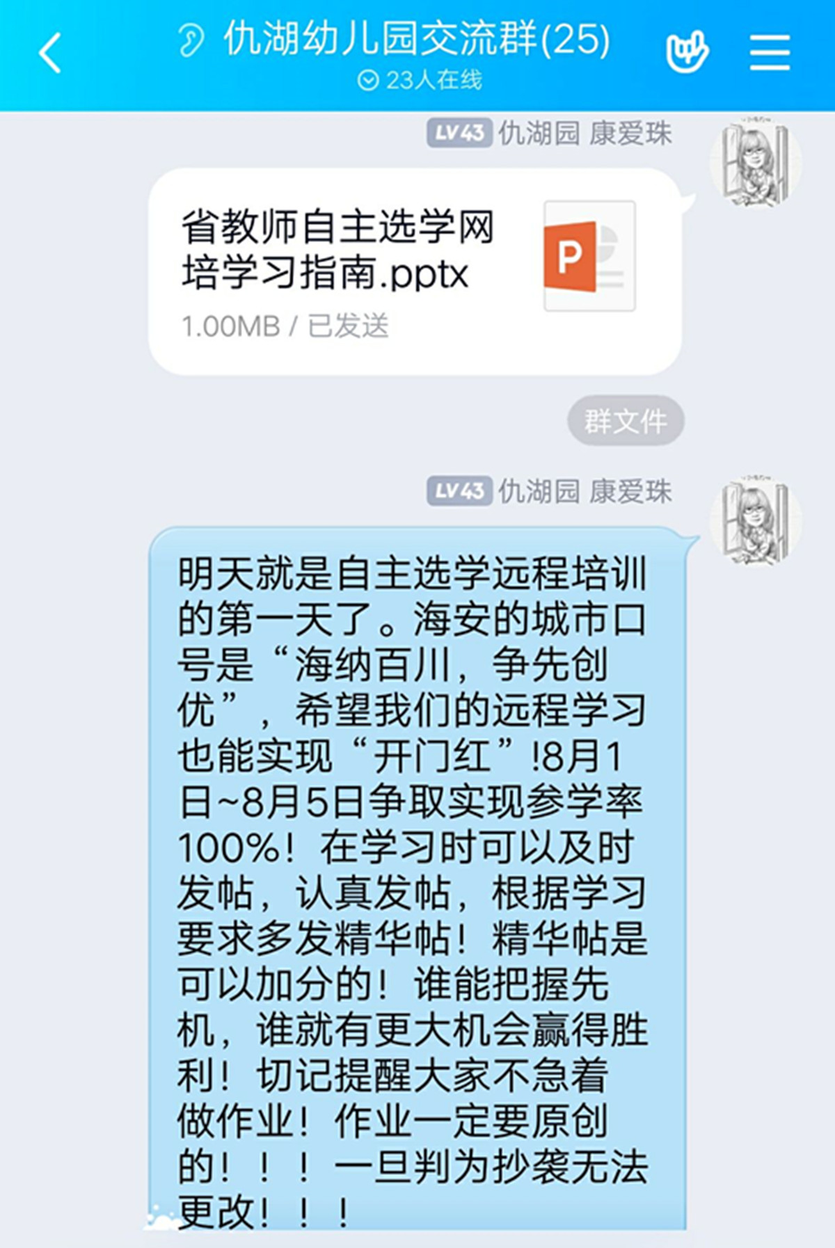 本次培训自选课程丰富,分别聚焦“幼儿教师师德”“幼儿园课程游戏化专题网络课程”“幼儿园教师专业发展的几个问题”等共53个版块内容,为增强教师师德修养和教育教学能力奠定了坚实基础。老师们通过观看专家讲座视频,积极参与线下及论坛讨论、发帖,进行课后练习、问卷调查、实践作业提交,并做相应的记录,学习劲头十足。